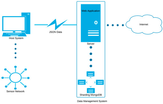 The data management system receives data from the sensor network through the host system via hypertext transfer protocol (http), formatting data in JSON. This allows sending and receiving of structured data using plain text, which simplifies and lightens the processing. JSON has many advantages over other existing formats, such as EXtensible Markup Language (XML [23]), requiring less boilerplate text to represent the data and a human-readable structure. Data management is divided in two different parts, kept in the same physical system for simplicity: the web application and the information storage system.