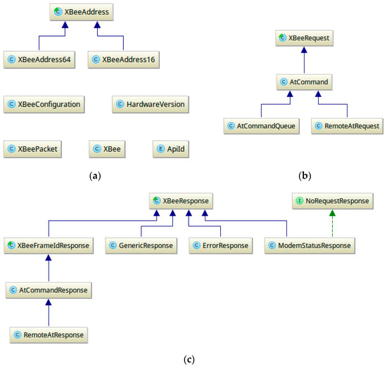 (a) Class hierarchy modelling the XBee according to the datasheet; (b) Class hierarchy modelling the XBee request according to the datasheet; (c) Class hierarchy modelling the XBee response according to the datasheet.
