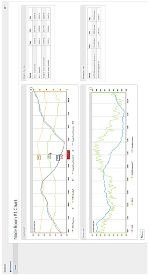The web application (Figure 14) allows the user to have a graphical view of the data collected by the network, enabling dynamic monitoring of the network state. It also permits the modification of network parameters such as the duty cycle or the power data transmission. This developed application is based on an event-driven model, where network control tasks are executed asynchronously according to the dynamic events generated by the network, mainly the sent and received packets. The most important feature of the view layer is the ability to plot the network data gathered from the sensors. The view layer relays on an application program interface (API) that allows sending of information using JSON format, easily exportable to other systems. On the other hand, a powerful JavaScript charting library has been used to plot the network data in a timeline. The view layer code plots the measurements by sensor node using a different scale per parameter. This representation allows the user to analyze the timeline at a glance. In addition, the software is able to refresh the charts in a timely manner with the new measures generated from the nodes.