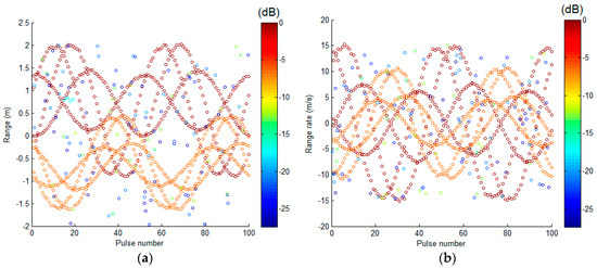 - Move to the next time index and let . According to the minimum Euclidean distance criterion [23], the optimal candidate of the scattering center track for the m-th range can be obtained by:where is the feature set of the candidate scattering centers within the gating area and are the features of the predictions from the previous observables. can be expressed as:where , and are weight factors and . According to Equations (23) and (26), Equation (25) can be rewritten as:Finally, by using Equation (30), the scattering centres association is accomplished.
