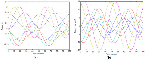 - Let m = m + 1. For the i-th scattering center track, search for the candidate scattering centers within the search window centered at ri,m−1, then record the candidate set . Here, for a small observation interval, we assume the amplitude difference between the adjacent observation times is very small, so the optimal candidate for the i-th track can be determined by:The other tracks are similarly associated with the scattering centers according to Equation (23). The acceleration of the scattering centers can be calculated as follows:Now, the initial state vector can be denoted as . Then, the next state can be obtained according to Equations (19) to (21).