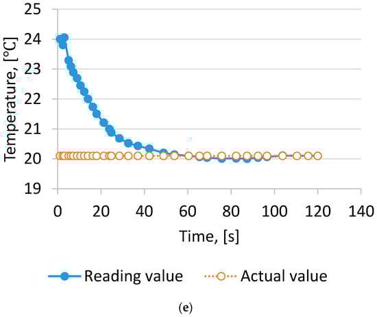 Wet bulb temperature readings with time. (a) wind velocity 1 m/s; (b) wind velocity 2 m/s; (c) wind velocity 3 m/s; (d) wind velocity 4 m/s; (e) wind velocity 5 m/s.