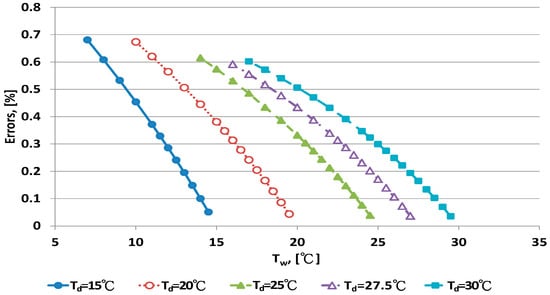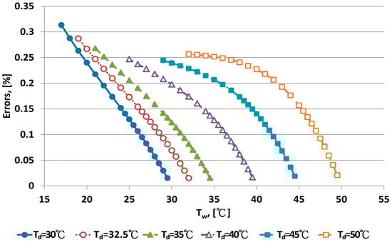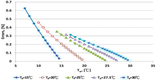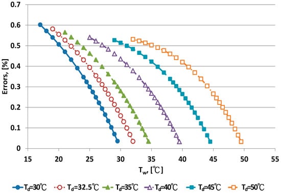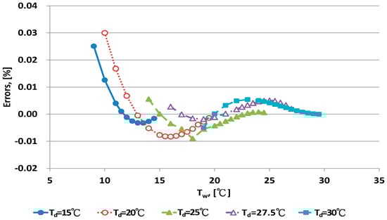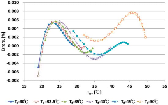 The error distribution for the new As equation for different dry bulb temperatures is shown in Figure 9 and Figure 10. With Td < 25 °C, larger errors were found at the lower range of Tw. With Td > 30 °C, error distributions were curved. With a more complex form of the As model, for example, when higher order polynomial equations were used, the error distribution of the curve shapes could be improved. However, the new As equation, Equation (10), could be easily computed with a calculator. The predictive value of errors was <0.1% RH. This error could be acceptable in term of practical application for humidity measurement [,], so Equation (10) is recommended as the adequate As equation.