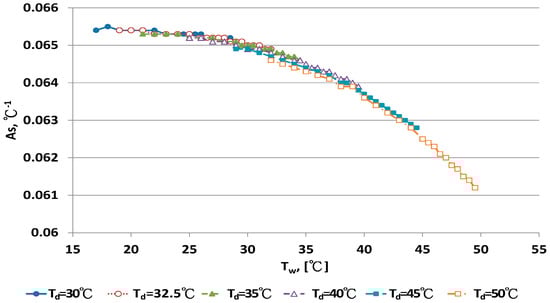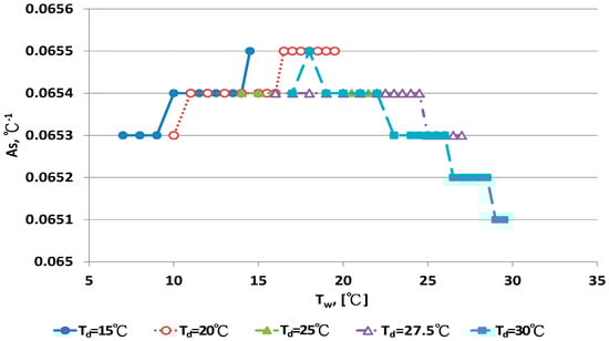 As values at fixed dry bulb temperature and different wet bulb temperature were calculated by the inverse technique from Equation (14). The relationship between As and wet bulb temperatures under 10 dry bulb temperatures is illustrated in Figure 7 and Figure 8. Figure 7 shows that As was nearly constant for dry bulb temperatures <30 °C. As was close to 0.0654 °C−1. The data distribution for As with Td > 30 °C in Figure 7 presents a clear curve shape. As strongly depended on the wet bulb temperature, Tw, and weakly on dry bulb temperature, Td. The relationship for As and the two temperatures were evaluated by regression analysis: