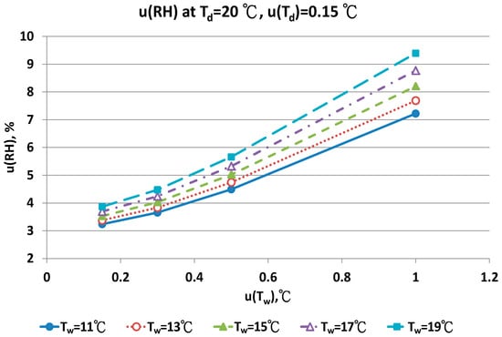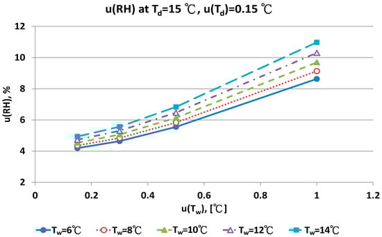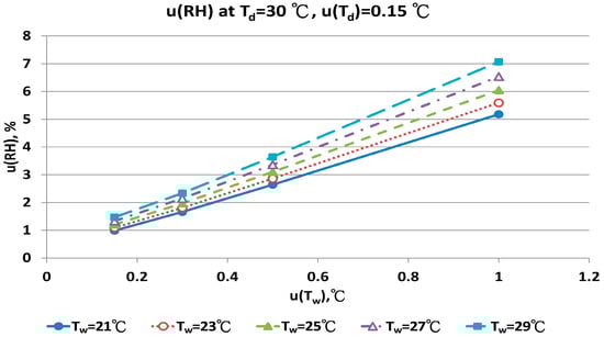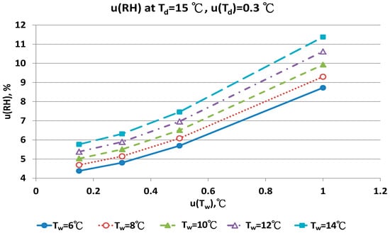 The combined uncertainty of the RH value, u(RH), evaluated by Equations (A5)–(A12) for four dry bulb temperatures with two uncertainties u(Td), 0.15 °C and 0.3 °C in different wet bulb temperatures, is in Figure 11, Figure 12, Figure 13, Figure 14, Figure 15, Figure 16, Figure 17 and Figure 18. The results of the calculation of u(RH) with other u(Td), 0.1 and 0.5, are available in supplemental information.