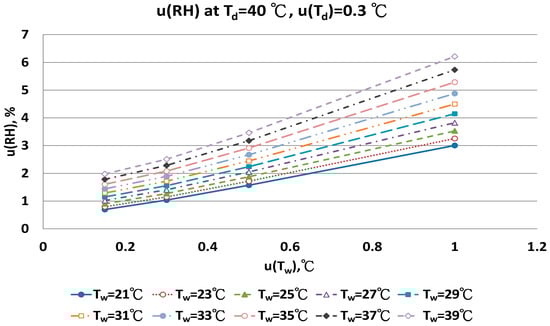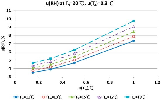 Figure 11 show that with increased uncertainty of the wet bulb thermometer, u(Tw) enhanced the combined uncertainties of u(RH). At the same u(Tw), higher wet bulb temperature induced larger u(RH) value.