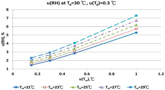 Uncertainties of relative humidity calculated with Equation (10) at Td = 30 °C, u(Td) = 0.15 °C, Tw = 21~29 °C and u(Tw) = 0.1~1 °C.