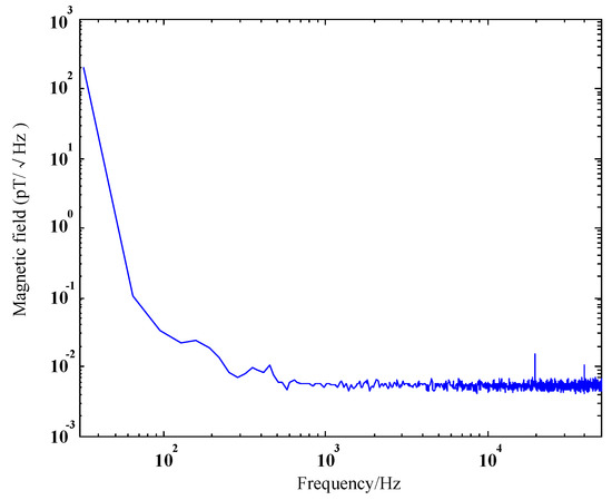 The system consists of three components, i.e., SQUID bootstrap circuit (SBC) and its readout circuit, development platform and computer. The SBC is a new dc SQUID readout circuit operating in the voltage bias mode [22], which can effectively reduce the preamplifier noise below the intrinsic noise of SQUID sensor. More details about the SBC in our experiment can be found in [22]. The development platform is based on CompactRIO developed by National Instruments, which has excellent adaptability in field environment. The high-precision data are sampled at a 100 kHz sampling rate by 24 bit analog-to-digital converters (ADC). The digital data are then stored in the computer and some postprocessing methods listed in later sections are performed on them. The noise floor of the SQUID sensor in the center of a medium magnetically shielded room measured by a spectrum analyzer (Agilen 35670A) is shown in Figure 2 and the noise is about 6 fT/@1.51 kHz. The noise below 100 Hz is very large because the measurement was conducted at day time with the influence of some external disturbances like a subway nearby. The large low frequency noise presented in Figure 2 should be mostly contributed from the urban environment noise since it differs much at daytime and at midnight. At midnight, we can find that the corner frequency of the noise is about 3 Hz and the low-frequency components are much smaller than that in Figure 2.