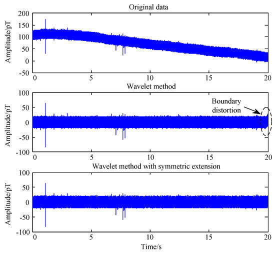 where, is the scaling function, is the wavelet function. The wavelet transform can be regarded as a filter bank and and are filter coefficients. The baseline wandering can be corrected by discarding the estimated low frequency components decomposed by the wavelet transform. As the length of real world signal is finite, the wavelet denoising method would cause distortion on the boundary of the signal. However, it was ignored in many wavelet-based filtering methods [20,21]. In order to alleviate the adverse boundary effect by traditional wavelet method, we extend the data at both ends of the according time series with a mirror extension. The corresponding waveform processed by wavelet methods, adopting “sym8” base [21] and 14 levels are shown in Figure 3. As the sampling rate is 100 kHz, the frequency components lower than 3 Hz will be filtered. It is shown that wavelet methods can provide perfect baseline correction results for our data. Moreover, the boundary effect caused by traditional wavelet methods can be eliminated by extending the data.