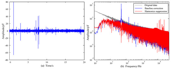 When is obtained by (4) and (6), can be derived by subtracting from [24]. It can be found that largely depends on the estimate of . However, is time-varying due to the drifting nature caused by generator and power plant design [3]. Consequently, the data should be divided into frames before LS estimation. A smaller length of the frame would lead to a better stationary characteristic of the data. While the performance of the LS estimation deteriorates as the number of samples decreases. Considering all these factors, the length of the frame = 0.2 s and the number of harmonics K = 20 were chosen. The waveform and the corresponding spectra of the processed data are shown in Figure 5. It can be seen in Figure 5b that the background noise is quite low in comparison to measurements in urban area and there are only odd harmonics in the measured data. As a result, the distortion of the spectra can be diminished by designing . The gray line denotes the spectra of the observed atmospheric noise before baseline correction. It can be seen that the low frequency components caused by baseline wandering are suppressed efficiently by wavelet denoising and the harmonics are further suppressed after LS estimation, which validates the effectiveness of the proposed method. To suppress the harmonics efficiently, the data were divided into frames before LS estimation. As a result, the low frequency part of the spectrum after harmonics suppression increases slightly in Figure 5b.