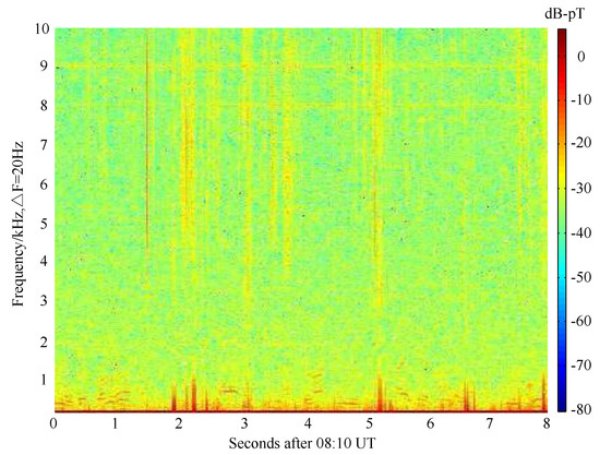 Spectral analysis can only provide the global characteristics of the data without any time information. The data measured at 8:10 UT on 2nd March with a length of 8 s is shown in spectrogram form calculated by the function “spectrogram” in MATLAB in Figure 6. The data are divided into overlapping time bins, followed with a short-time Fourier transform performed on each time bin, between 0 and 50 kHz. The data bin size is 50 ms (i.e., = 20 Hz) with 50% overlapping. Longer bins have less bandwidth within each bin and thus higher resolution in spectra, but the time resolution is reduced, correspondingly. The amplitude of received signals in each frequency bin, and for each time bin, is indicated with the colorbar in Figure 6.