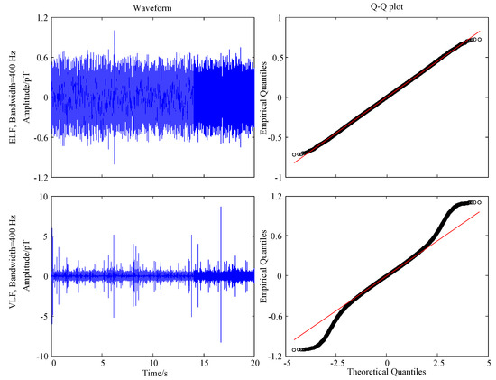 Waveform and the corresponding QQ -plot of the extremely low frequency (ELF) and very low frequency (VLF) noise. QQ-plot is performed for the noise processed by a hole puncher with a threshold of four times standard deviation.