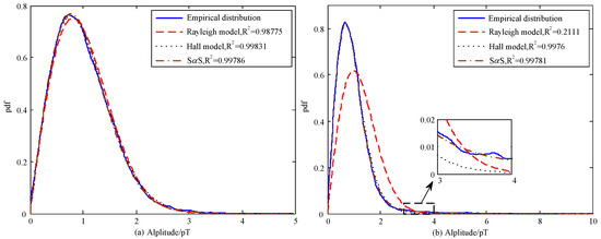 It is known for a long time that the phase of the atmospheric noise follows the uniform distribution over the angles to π [5]. As for the envelope , there are several models used in recent literature to describe it, such as Hall model, Field and Lewenstein (F-L) model, Middleton’s Class A and Class B model, and α-stable distribution [32,33]. Considering the preliminary statistical results in [5], Hall model and SαS distribution are more suitable to describe the narrowband ELF/VLF noise. Consequently, only Rayleigh distribution, Hall model, and SαS distribution are considered in this paper.
