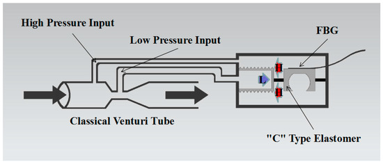 Figure 1 describes the typical structure of a differential pressure sensor including the FBG. In differential pressure sensing, a pressure-transferring diaphragm is required to have contact with the medium in both directions. Usually the sensing unit should be immersed in the measured fluid, which may result in interference to the measurement. In order to guarantee the sensitivity and durability of the sensor, special approaches should be taken in real measurement environments with high temperatures, high pressures, overload [7,8] and corrosion [9,10].