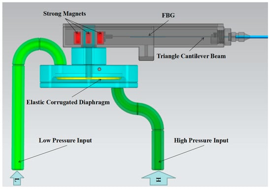 In order to sense the differential pressure effectively and to protect the sensor from invalidity caused by the contact of the FBG with the fluid to be measured, we propose a sensor structure with a magnetic transfer mechanism. As seen in Figure 2, four parts are included in this sensor structure as follows: the pressure-transferring part comprised of three strong magnets and an elastic corrugated diaphragm; the input part for differential pressure with a high pressure input channel and a low pressure input channel; the part in which a triangle cantilever beam is used to convert the differential pressure to the wavelength shift of the FBG; and a limiting mechanism which is used for resisting overload [11]. A structure design for insulating the fluid and FBG is the most critical aspect.