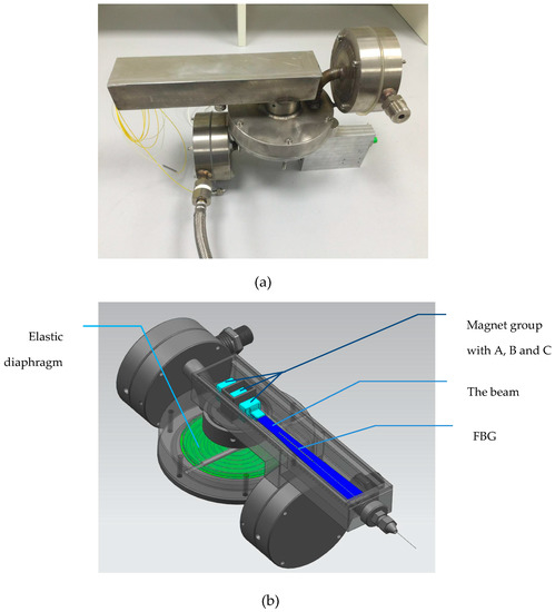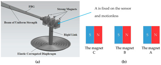 Usually, it is not easy to separate the FBG from the measured fluid. In order to solve this problem, we introduced a special mechanism with magnetic transfer to isolate the FBG from the measured fluid, where three identical strong magnets are used, described as A, B and C, respectively, in Figure 4a. Magnet A is fixed, and the S pole of A faces the N pole of B. While magnets B and C are movable, magnet B is linked rigidly with the center of the elastic corrugated diaphragm; the S pole of B faces the N pole of C, and magnet C is fixed to the movable end of the beam. A, B and C are attracted to each other and must keep equal distances of about 3~5 mm between each other. Actually, among them there must be an isolating structure (such as a polymer spacer) to prevent them from close contact. The FBG is fixed on a beam of uniform strength. It is insulated between the top and bottom surfaces of the diaphragm. When there is a difference in the pressure between the top and bottom surfaces of the diaphragm, the center of the diaphragm moves up or down, leading the movement of magnet B through the rigid link, therefore synchronously driving magnet C by means of the magnetic force. The side of the S pole of magnet C is connected to the movable end of the cantilever beam; therefore, the difference of the pressure is transferred to the FBG.