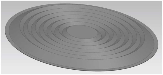 The 1:1-scale three-dimensional (3D) model of the elastic corrugated diaphragm is imported into ANSYS at first, as shown in Figure 6. In this figure, the diameter of the full-size diaphragm is 100 mm, and the corrugation type is chosen as “triangle waveform” (6 rings) with a corrugation depth of 2 mm. The material of the diaphragm is stainless steel film. And the parameters of the diaphragm are listed in Table 1.