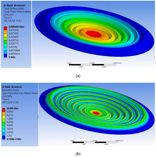 Then we simulated its mechanical property in a certain range of pressure differences (0~10 kPa). As an example, Figure 7 gives the deformation and force distribution of the diaphragm under a differential pressure of 10 kPa when the thickness is 0.2 mm, where the pressure difference may be reflected through stress at the center of the diaphragm.