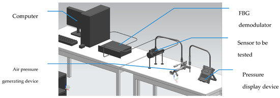 The test system included the air pressure difference–generating device, the air pressure display device, a computer, an FBG demodulator and the sensor to be tested. The air pressure–generating device was made of stainless steel, which can provide an accurate and stable pressure source. The sensor to be tested was mounted on an interface of the pressure source, and the calibrated pressure meter was mounted on another interface of the source. The value of the calibrated pressure meter was displayed as a reference value. The light signal from the sensor was analyzed by the demodulator and displayed on the PC.