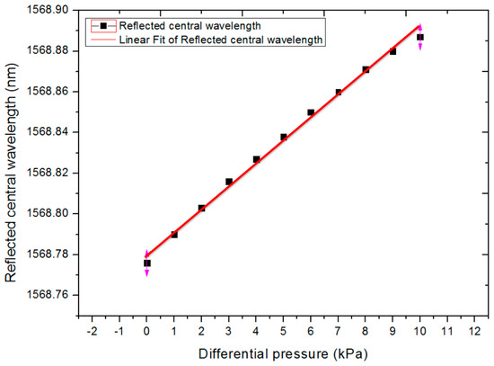 The test results (the calibration curve) are shown in Figure 10. We have fitted the data to a straight line with λB = 0.0112 × P + 1568.780, with a linear correlation coefficient of 0.994, and we obtained the sensitivity of the sensor as 0.0112 nm/kPa. The relations between the central wavelength shift of the FBG and the differential pressure were almost linear.