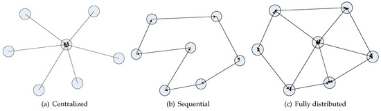 The sequential projection method, also termed POCS (projection on convex sets), is a cyclic algorithm [38]. From Figure 1b, we can see that the data are processed across sensors in sequence. The method is used for the energy-based source localization problem in [38]. The update rule of the sequential projection method is given as follows: