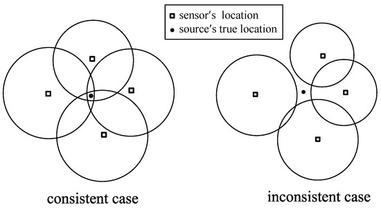 However, due to the observation noise, the source may not appear on the circles defined in Equation (20), but be included in a ring area, i.e., if a area of the noise distribution is adopted, where ζ is a constant (Generally, –3). This will lead the source localization problem being a non-convex optimization problem, which is generally difficult to handle. To overcome the difficulty, a relaxation method needs to be used. We define a convex set, which is a circular area: