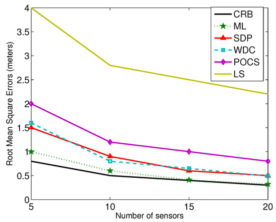 After obtaining the formulation in Equation (15), the source localization problem was solved by a two-stage closed-form solution proposed in [35]. The basic idea of the two-stage least-squares method is that in the first stage, θ and are considered as independent unknown variables. The source estimate can be obtained using the standard weighted least-squares method. Then, in the second stage, the relationship between θ and is explored to improve the result. The details of the algorithm can be found in [35].