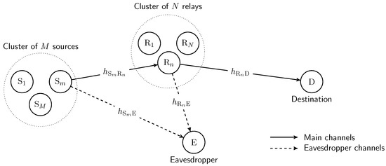 Let us consider a multiuser and multirelay cooperative network, where a source communicates with a destination via the help of a relay with the presence of an eavesdropper as depicted in Figure 1. Specifically, the system is composed of a set of M sources , a set of N relays , one destination and one eavesdropper . We assume that the direct links between the users and the destination are not available due to the destination being out of the coverage area, or severe fading, or deep shadowing, as in [16,17,23]. Moreover, the data transmission from the source to the destination is carried out through the support of the decode-and-forward (DF) relays. Specifically, a time-division multiple-access scheme is used for orthogonal access, and we assume perfect synchronization in the network. The slot of one data transmission is divided into two sub-slots, which equal the time duration. In the first sub-slot, a selected source broadcasts its signal. In the second sub-slot, a selected relay perfectly decodes the received signal from the source and then forwards the signal to the destination. Considering the physical layer security of such a cooperative network, we assume that an eavesdropper monitors the communication between legitimate users, i.e., the user and destination. We further assume that all nodes are equipped with an omnidirectional antenna and operate in half-duplex mode. All wireless links are assumed to undergo independent and identical distributed (i.i.d.) Rayleigh block flat fading. In order to provide a comprehensive analysis of the PLS of the considered relaying system, we assume that the required channel state information (CSI) is available, as in [16,17,25].