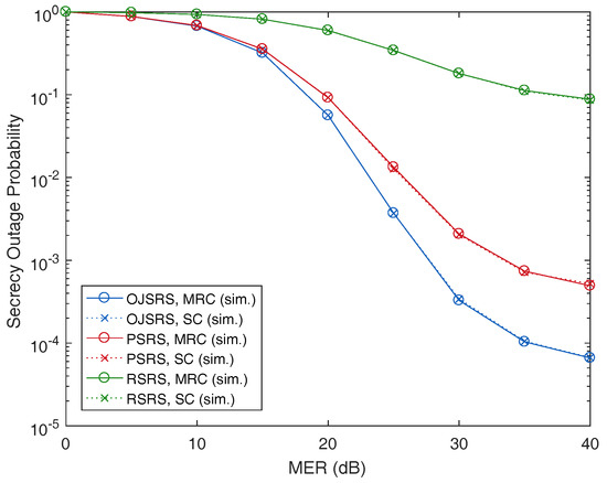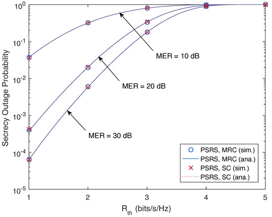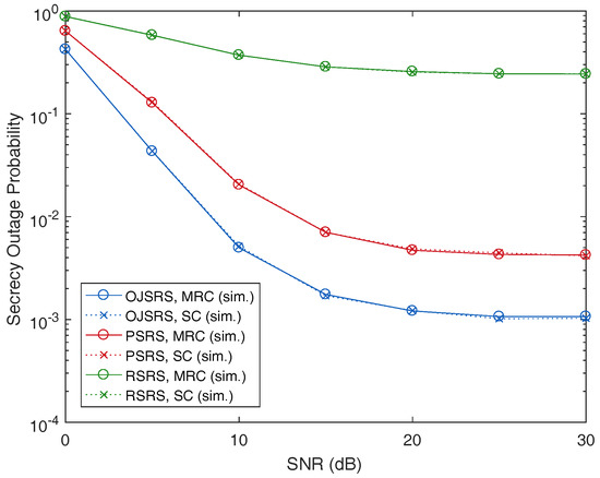 As shown in Table 1, the secrecy outage probability (SOP) in the case of the eavesdropper using MRC is larger than that of the case of using SC. This means that the relaying system is more vulnerable when the eavesdropper uses MRC compared to the case of using SC. The reason is that with the MRC technique, the eavesdropper is able to collect more information of the transmit data than using the SC technique. However, the eavesdropper can only employ the MRC technique when the source and relay use the same codeword to encode the transmitted signal, e.g., repetition coding [29]. Otherwise, the eavesdropper employs the SC technique [26,36], which is to choose the strongest overheard signal among that transmitted from the source or relay.