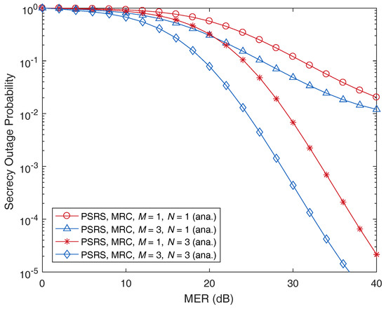 We now turn our attention to the impact of the numbers of sources and relays on the secrecy performance of the PSRS scheme. In Figure 8 and Figure 9, we plot the SOP as a function of MER and SNR, respectively, with different numbers of sources, M, and relays, N. As can be observed, when the number of sources or relays increases, the SOP decreases. This means that when more nodes participate in a cooperative relaying transmission, the security of the transmission will be improved. Please note that one possible reason for the benefit of user/relay selection is that in wireless communications, independent users have a low probability of experiencing the deep effects of fading simultaneously [40]. Therefore, if more sources and relays participate in a cooperative transmission, we have more chances to choose ones that exhibit low-correlated, better channel conditions, which leads to a better cooperative transmission and a robustness to attacks from eavesdroppers (according to information-theoretic perspectives). Thus, increasing the number of sources and relays can improve the PLS, i.e., decrease the secrecy outage probability (SOP), of cooperative relaying transmission.