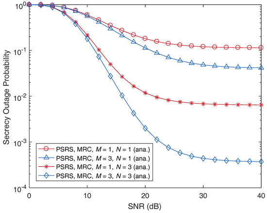 Moreover, the SOP decreases more quickly when M is fixed and N is increased than M is increased and N is fixed. This observation means that the number of relays has a stronger impact on the secrecy performance compared to that of the number of sources. It can be explained as follows. Please note that we assume that the direct links between the sources and the destination are not available due to severe fading or deep shadowing as in [16,17,23]. Hence, the relays play a key role in such cooperative relaying transmissions. On the other hand, in the proposed source-relay selection scheme, the selected source is separately chosen based on the channel conditions of the links from sources to the eavesdropper, while the selected relay is chosen based on the channel conditions of the links from the selected source to the eavesdropper, from the relays to the eavesdropper, from the selected source to the relays and from the relays to the destination. Because the relays are greatly involved in the cooperative transmission with PLS compared to the sources, the number of relays therefore has more impact on the secrecy outage performance, i.e., more decreasing of the SOP, than that of the number of sources.