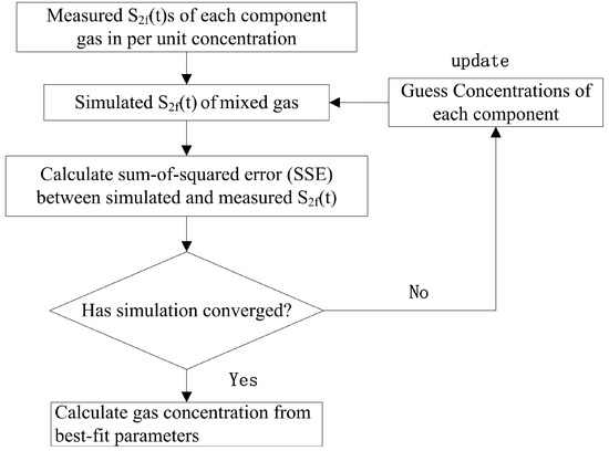A multicomponent spectral fitting algorithm, based on multivariate regression and nonlinear least square fitting [16], is used to calculate the multi-component concentration in a mixture according to Equation (6). The steps of this algorithm are displayed in Figure 1.