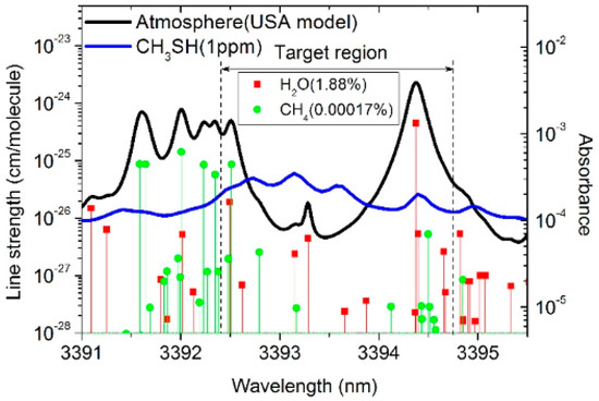 Several common methods are used for CH3SH detection, including combined gas chromatography and mass spectroscopy (GC–MS) [6,7], gas sensors [3,8,9], chemiluminescence [10,11,12], and mid-infrared (MIR) laser spectroscopy [13,14]. GC–MS and sensors such as biosensors can provide accurate analyses down to a few ppb; however, these methods are either costly or have a short lifetime. Electrochemical devices are only sensitive to ppm level of CH3SH, which greatly exceeds the olfactory threshold [8]. Gaseous CH3SH should be collected and react with certain chemical substances before the detection using chemiluminescence. Although it can achieve ppb levels and near real-time detection, it is complex for the maintenance of the equipment. MIR laser spectroscopy has also been used for CH3SH detection due to its high sensitivity and fast response. Vance et al. [13] characterized CH3SH absorption using a carbon isotope laser spectrometer. A 3.27 µm infrared tunable laser spectrometer (TLAS) was recommended for monitoring CH3SH in situ and real time as earth-based bio-signatures for extraterrestrial exploration. The selected spectral line absorption can be influenced by significant interference, especially by methane absorption. We previously examined CH3SH absorption features from 3260 to 3400 nm and selected the spectral line at 3393.584 nm for measuring CH3SH using direct absorption TLAS technology [14]. The detection limit was 25 ppb, and the integration time was 1.84 s under laboratory conditions in the measurement of pure CH3SH. However, the detection of CH3SH in the atmosphere will be disturbed by interfering atmospheric absorption, while CH3SH concentration is lower than several ppm [14].
