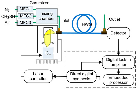 The sensor mainly comprised a 3392 nm ICL (Nanoplus GmbH, Gerburnn, Germany) as the optical source, a hollow waveguide (HWG, Polymicro Technologies, Brookfield, Illinois, USA, Type HWEA10001600) as the gas cell, a laser controller (ILX Lightwave, Irvine, CA, USA, LDC-3908), a photodetector (Thorlabs, Newton, NJ, USA, PDA20H-EC), and a homemade digital lock-in amplifier (DLIA) (Figure 3). The DLIA contained a direct digital synthesizer, a phase sensitive detector, a digital low-pass filter with selectable order and time constant, and an embedded processor. The laser was placed in a homemade laser mount, and both the temperature and the current of the laser were controlled by the laser controller. The beam emitted from the ICL was collimated with an aspheric lens, coupled into the HWG by an off-axis parabolic mirror, and then collected by the photodetector. The 2f signal was demodulated and processed by the DLIA to obtain the target gas concentration.