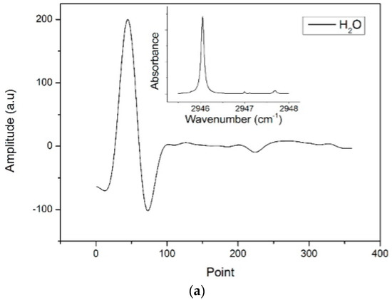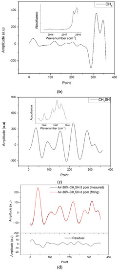 To obtain the reference signals for fitting according to the algorithm discussed in Section 2, the 2f signals of CH3SH, CH4 and H2O were measured with the experimental system (Figure 3). The flow rate of all gas samples was controlled by a mass flow controller (MFC, Type 8715, Burkert Inc., Shanghai, China) and set to 500 mL/min. The HWG was first filled with N2 and then with a reference gas. Because the HWG volume was small (~4.7 mL), the reference gas immediately filled the HWG within 1 s and the etalon fringes were unable to change. Therefore, the differences between the 2f signals of the reference gases and N2 could be used as reference signals that were free of etalon fringes. The reference signals of CH3SH and CH4 were obtained using reference gases with concentrations of 10 ppm and 3 ppm, respectively. In contrast, the reference signal of H2O was obtained using air with different concentrations of H2O. The concentration of H2O in the air was increased by a humidifier, and the difference between the 2f signals of air with high and low concentrations of H2O was used as the reference signal. There was no specific concentration of the obtained H2O reference signal; therefore, the measured concentration of H2O was simply a ratio of the concentration of the H2O reference signals rather than an absolute value. Thus, the reference signals obtained had a high signal–noise ratio (SNR), were free of etalon fringes, and had the tuning characteristics of the laser and the response characteristics of the detector. The measured reference 2f signals and the absorption spectrums in 2945.5–2948 cm−1 (3392.1–3395 nm) of CH3SH, CH4 and H2O are shown in Figure 4a–c, respectively.