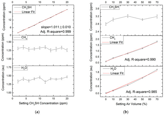 The average and standard deviation of measured concentrations of CH3SH, CH4 and H2O in the two groups are shown in Figure 5a,b. The measured concentrations of CH3SH are in good agreement with the setting concentrations, with a linearity of 0.999 (Figure 5a). The accuracy of the CH3SH measurement is 1.1%, which can be deduced from the linear fitted slopes of 1.011 ± 0.010. The measured concentrations of H2O and CH4 are 1.307 ± 0.0954 arbitrary unit (au)and 1.401 ± 0.186 ppm, respectively. As shown in Figure 5b, the measured concentrations of H2O and CH4 agree closely with the setting volume fraction of air, with good linearity. The standard deviations of measured concentrations of CH3SH are no more than 0.1 ppm.
