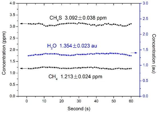 Sixty successive measurements with 1 s intervals were performed with the flowing gas sample of 3 ppm CH3SH, 50% air fraction, and N2. The measurements yielded average concentration values of 3.092 ± 0.038 ppm, 1.213 ± 0.024 ppm, and 1.354 ± 0.023 au for CH3SH, H2O, and CH4, respectively, indicating corresponding precisions of 1.2%, 1.7% and 2.0% for the concentration measurements of the sensor (Figure 6).