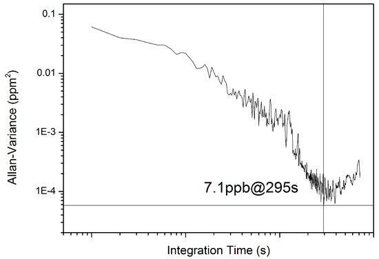 Forty min continuous measurements of 10 ppm CH3SH in flow mode were performed to calculate the Allan variance. The results indicate that the sensor achieved a detection limit of 7.1 ppb with an optimal integration time of 295 s (Figure 7), which corresponds to an absorbance of 3.6 × 10−5. The detection limit can possibly be further improved by restraining etalon fringes and lengthening the HWG.