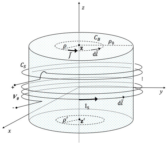 The equivalent circuit components representing the coil can be obtained from Equation (1), by inserting the explicit expressions of the magnetic vector potentials. The current density distribution flowing into the body, assuming cylindrical symmetry, is written as