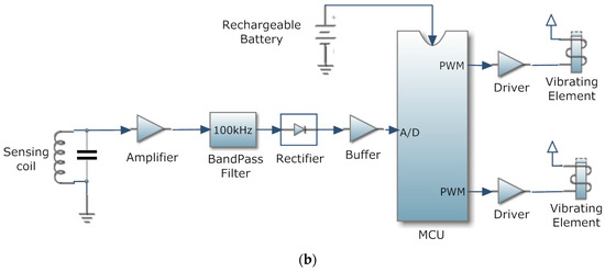 (a) A picture of the receiving system; (b) Block diagram of the receiving circuit: The analog signal detected by the coil is amplified, filtered, and rectified. The microcontroller (MCU) converts the signal into a digital sequence, whose peaks are evaluated and used to drive the vibration motors placed on both arms of the runner. PWM: pulse width modulation.