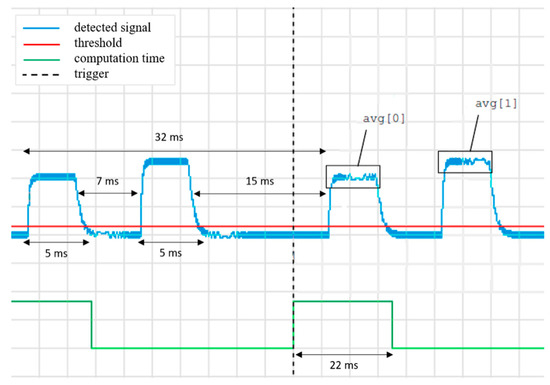 As thoroughly explained in Part I of this paper, the signal is a sequence of two peaks (maximum induction magnetic field strength B = 24 nT), separated from each other around 7 ms, and repeated every 32 ms. After amplification, the signal enters a second-order band pass filter (Single-Amplifier Biquadratic Active filter [13]), which is then amplified again and rectified. Such an output is then low-pass filtered to reduce the ripples and then buffered again to enter the analog-to-digital (AD) converter of the microcontroller (MCU). The firmware implements a circular buffer 32 ms long with a sampling period (i.e., 125 samples, corresponding to a sampling rate of about 3.9 kHz). Once the receiver detects no signal for a time longer than , it scans the received buffer backwards trying to identify two consecutive peaks with an intermediate pause no longer than 10 ms. This means that when 40 consecutive samples are below a noise gate level (where the amount is 4% of the range of the AD converter), the whole buffer is evaluated in order to determine the amplitudes of the two peaks which are at an approximate distance of 7 ms. To avoid missed triggers, the computation has to conclude before the next long pause occurs (for example, 22 ms are required to scan the peak heights for a sequence of 125 samples, as shown by the busy flag in Figure 4).