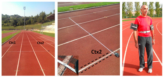 The tests were performed at an outdoor running track with a synthetic rubber flooring and eight lanes, with each lane 122 cm wide. Two wires with a length of about 400 m and cross-section of 2.5 mm2 were placed on the floor along the whole perimeter of the track, with a distance of approximately 3.6 m from each other, delimiting a path which included the second, third, and fourth lanes of the track. As shown in Figure 6, the athlete was equipped with the receiving system which consisted of a sensor belt around his waist and two vibrational warning signals around his upper arms.