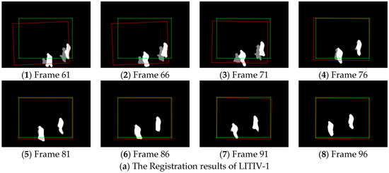 We can see that a transformation is found soon after a target first becomes visible in both the infrared and the visible videos (this happens at different moments in each video pair; the earliest results are shown in Figure 7 (1) of each result sequence), even if these videos were taken at various sensor positions. At this time, the alignment of foregrounds is acceptable, except LITIV-1. In LITIV-1, an infrared target is seriously incomplete when we first calculate the homography. Hence, we cannot obtain correct matches in precise registration, which results in the stagger of the matched foregrounds. However, the homography is refined to register the foregrounds sufficiently well over time in all pairs. In LITIV-1 or LITIV-2, an accurate transformation is found less than 30 frames after first calculating the transformation, although the movement of the targets is faint.