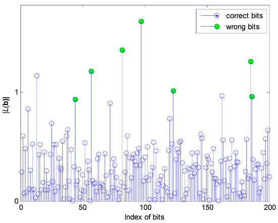 According to Figure 2, it is clear that most of the wrong bits and the right ones have a significant difference in the feature space mapped by |L(b)| among the 200 tested bits, so it is accessible to map b into a one-dimension feature space |L(b)| to preliminarily identify the wrongly received bits.