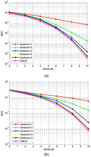 Consequently, many studies have been performed on suboptimal multiuser to obtain less complexity and good BER performance. Of them, linear multiuser detection has been widely studied as low-complexity integrated mathematical analysis [8,9]. Matched filter (MF), decorrelating (DEC) and minimum mean square error (MMSE) are three representative linear multiuser detection methods. Linear multiuser detectors form the output based on various linear filters. In recent years, considerable attention has been focused on blind multiuser detection, which requires the prior knowledge of only the signature sequence and timing of the desired user [10,11,12,13,14,15,16]. In [13], a novel subspace tracking algorithm by orthonormalizing the eigenvectors using an approximation of Gram-Schmidt procedure was applied to blind multiuser detection. This scheme demonstrates the performance improvement for non-stationary cellular CDMA environment. Besides, suboptimal multiuser detection algorithms based on SINR Lower Bound [17], box-constrained deregularization [18], compressive sensing [19], restricted search space [20], decision-level data fusion technologies [21] and opportunistic multiuser detection [22,23] were analyzed in recent years. As for coded DS-UWB systems, iterative multiuser detection methods were also widely analyzed. Usually these suboptimal multiuser detection algorithms seek tradeoff between computation complexity and BER performance. On the basis of the Turbo decoding algorithm, various iterative multiuser detection algorithm were proposed [24,25,26,27]. Reference [26] proposed an iterative multiuser detector for overloaded LDPC coded CDMA systems. This receiver consists of a combination of matched filters in the first stage and a linear MMSE detector and an interference cancellation scheme in the successive stages. In this way, the receiver achieved better BER performance than Turbo coded systems.