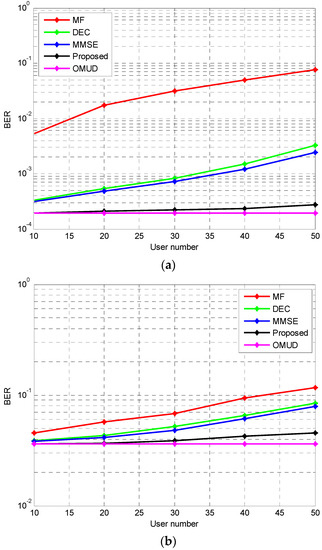 In this subsection, we consider the 20 and 50 user conditions. The number of iterations for the proposed multiuser detection algorithm is 5. The performance of MF, DEC, MMSE and OMUD are compared.