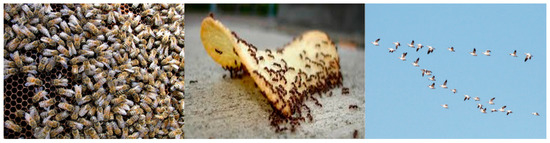 Pet-Bot is a robot that accompanies a human by using LF (Low Frequency) wireless communication to identify a specific user and his/her location. Its purposes are to provide walking-assistance and to carry objects. The Pet-Bot in previous research had a limited number of robots available to each user. This caused problems when a user had to carry many objects at one time or had something too heavy to be carried by a single robot. Swarm is a population whose members have an organic relationship with each other, e.g., bees, ants, and migratory birds, as shown in Figure 1. Moreover, it has two remarkable characteristics: optimal method detection and a parallel process for accomplishing a goal. There has been research that mimics swarm’s characteristics. One study, which mimics swarm’s optimal method detection, is the ACO (Ant Colony Optimization) [2]. However, in this study, since we focus on an extension of Pet-Bot’s application area and utilization, we adapt swarm’s parallel solving process, which is suitable for overcoming the limit of previous Pet-Bots.