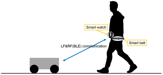 The Pet-Bot system provides walking-assistance and helps in carrying objects with a mobile robot that accompanies a user wearing smart wearable devices, as shown in Figure 2. To provide these services, it is essential to identify the authorized user and his/her location. The Pet-Bot uses LF communication, which is used in vehicle smart keys, radio navigation, etc. for this purpose. Authorized user identification is implemented by assigning a unique pattern ID to the LF signal and the smart wearable devices’ LF receivers. An LF signal with the same pattern ID as the LF receiver will wake up a smart wearable device that is in idle state and convert it to active state. Moreover, the Pet-Bot is capable of accurately identifying a specific user’s location using an LF signal having high transmissivity, which allows it to be transmitted through obstacles.