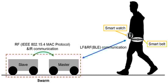 Figure 3 shows the overall setup of the Pet-Bot system to support swarm-driving. The user wears a smart watch for sending commands to the robot, and a belt for providing location and activity information. The Pet-Bot uses LF communication for user location identification, and BLE (Bluetooth Low Energy) to obtain information of the user location and activity. Using the middleware proposed in this study, the Pet-Bot can organize a swarm of at least two robots, according to the user’s request through the smart watch, as shown in Figure 3. The role of each robot in the swarm is classified as master or slave, according to the state of connection with the user. The robots in the swarm use the RF communication to exchange essential information for building and maintaining the formation, and IR communication, which is suitable for short-distance estimation, for relative-location identification.
