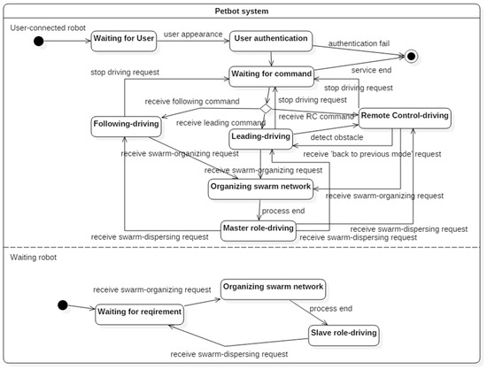 Figure 4 shows the state diagram of the overall Pet-Bot system. The user-connected robot can enter the state for organizing the swarm network from all the supported driving states (leading, following, and remote control), according to the user’s request. Then, the user-connected robot sends the swarm-organizing request to the waiting robots. After the swarm network is organized, the user-connected robot enters the master-role driving state. When the user requests the swarm to disperse, the robot reenters its previous driving state. The waiting robots around the user-connected robot enter the organize-swarm-network state when they receive the swarm-organizing request from the user-connected robot. After the swarm network is organized, the robots enter the slave-role driving state and return to the waiting state when they receive the swarm-dispersing request.